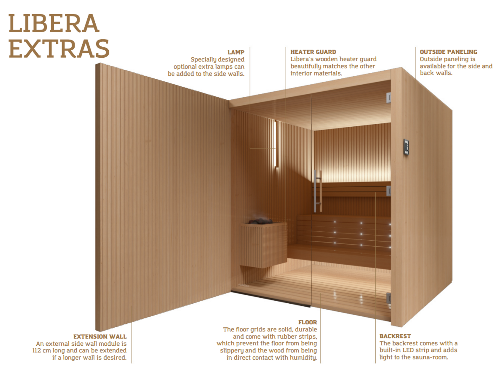 Denna bastu gör det möjligt att lägga till en extra vägg utanför, en slags yttre fortsättning på bastuns inre väggar. På utsidan smälter de vertikala väggpanelerna perfekt in i de omgivande rummen, och på insidan skapar de upprättstående linjerna en känsla av lätthet och lätthet. Liberas namn återspeglar dess natur: en plats som lyfter upp din själ, ger dig en känsla av frihet och ger dig känslor av skönhet, välbefinnande och harmoni.