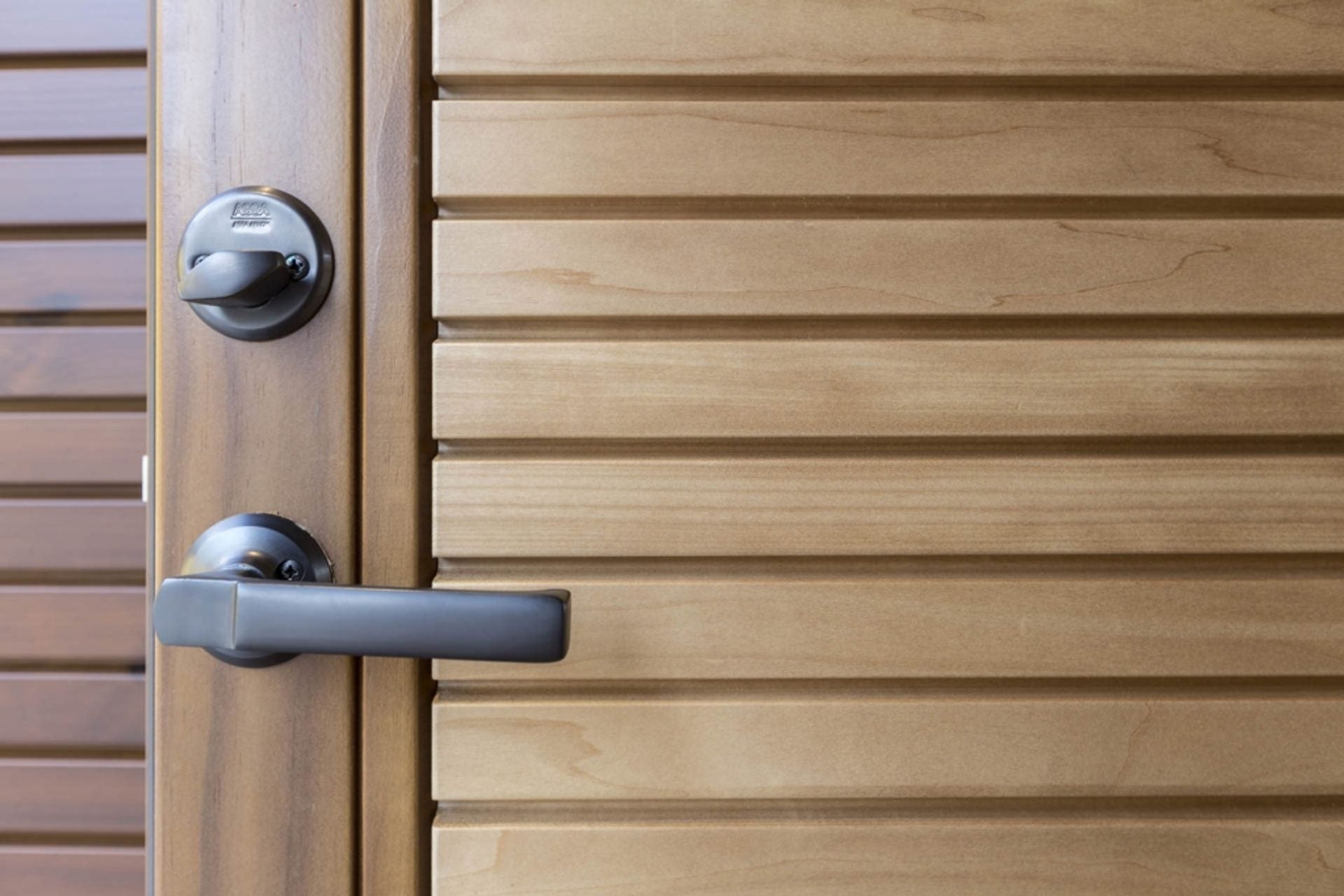 - Ytterdörr: trädörr, brun finish med UV-skydd, handtag och lås med svart oxidfinish