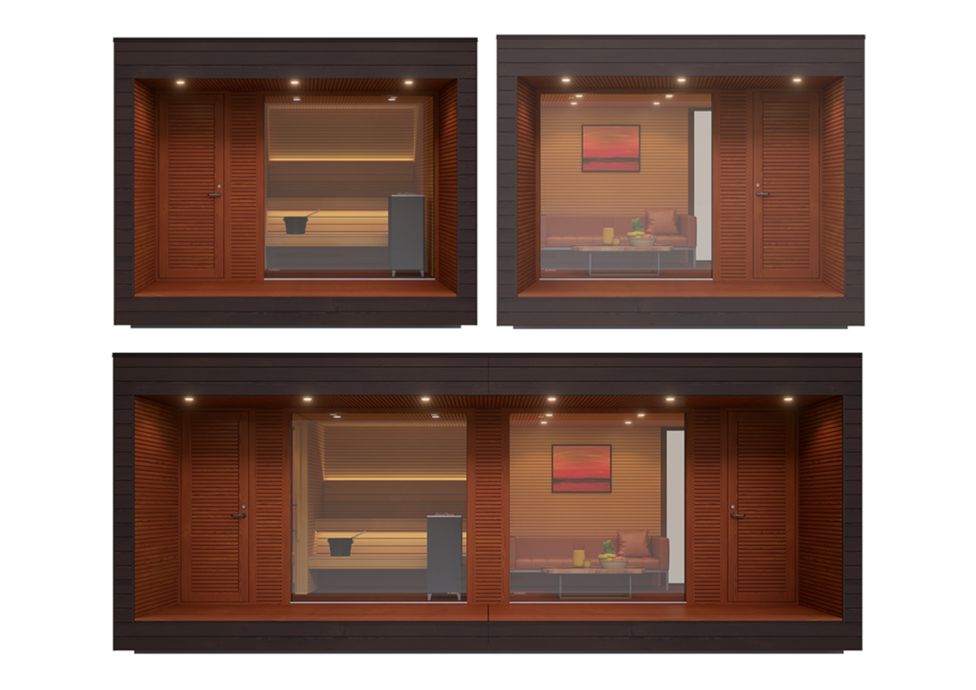 Terrassens utsökta djupbruna färg charmar med sin raffinerade elegans på utsidan medan den varma färgen från den värmebehandlade aspen värmer om dig på insidan. Det stora fönstret på framsidan öppnar sig för en trevlig utsikt över utomhusmiljön. På terrassen kan man dessutom uppleva den omgivande naturen utan filter - se dess skönhet, känna dess andedräkt, vindar och dofter. Allt med den här bastun talar för kvalitet. Den yttre beklädnaden är utformad för att tåla svåra klimatförhållanden: det nordiska granvirket är värmebehandlat, borstat och målat. Väggarna, golvet och taket är effektivt isolerade och den solida takkonstruktionen klarar tunga snölaster. Alla dessa komponenter skapar tillsammans en bastu med höga värmeisoleringsegenskaper och utmärkt hållbarhet. En av de bästa egenskaperna hos Natura är modulariteten. Förutom bastukabinen finns det en loungemodul som är utformad med samma storlek och utseende. Man kan installera två bastur intill varandra med en gemensam terrass eller bygga olika enheter av bastun och loungen. Det finns många kombinationer för att skapa ett mysigt uterum, som bara begränsas av fantasin.