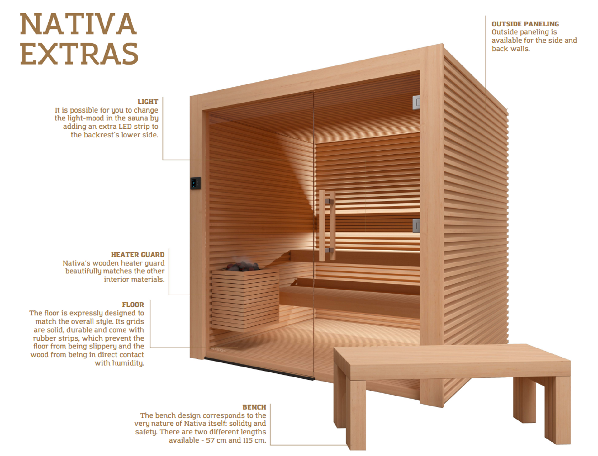Nativa är en bastu där enkelhet och rationalitet är en självklarhet. Den är utformad för att ge en känsla av lugn och ro.